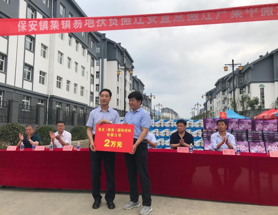 2019年6月26日,洛南縣保安鎮(zhèn)人民政府組織舉辦了保安鎮(zhèn)易地扶貧移民搬遷戶集中入住捐贈儀式,縣委常委、常務副縣長李凌云同志,以及西北(陜西)國際招標有限公司、中建一局西北公司等相關單位參加。捐贈儀式上,我公司胡亞夫主任代表公司扶貧獻愛心向洛南縣保安鎮(zhèn)人民政府捐款2萬元整。