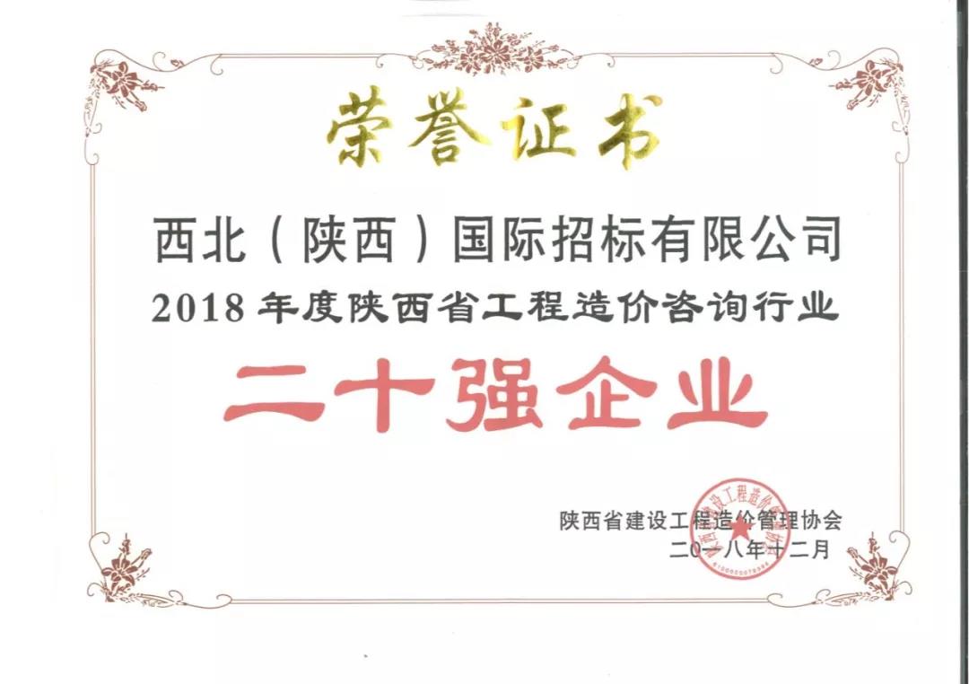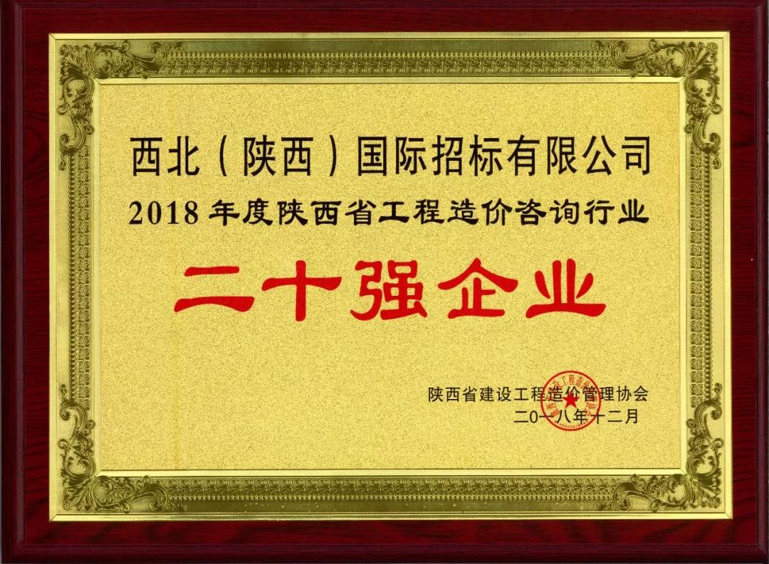 2018年11月30日,陜西省建設工程造價管理協(xié)會發(fā)布陜價協(xié)發(fā)〔2018〕31號文件,發(fā)布2018年度陜西省工程造價咨詢20強企業(yè)名單,西北(陜西)國際招標有限公司再次入圍,榮獲“第七名”。