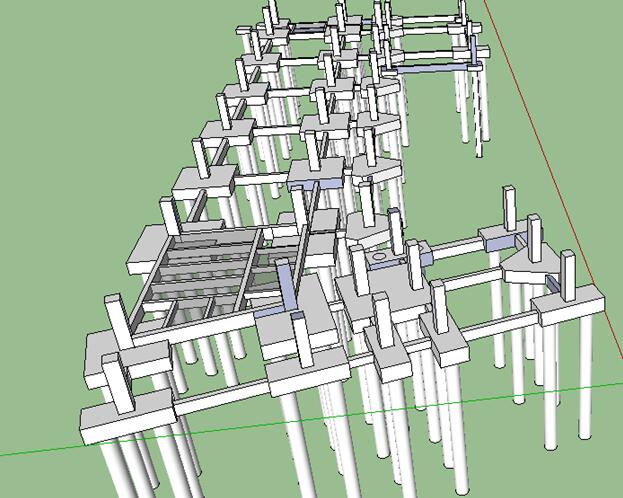 3、項(xiàng)目部成立BIM工作組對施工現(xiàn)場每一樓棟基礎(chǔ)BIM建模。因本項(xiàng)目依山而建,各棟教學(xué)樓標(biāo)高不一,且均有走廊連接,各棟樓之間如果出現(xiàn)標(biāo)高誤差后果嚴(yán)重。